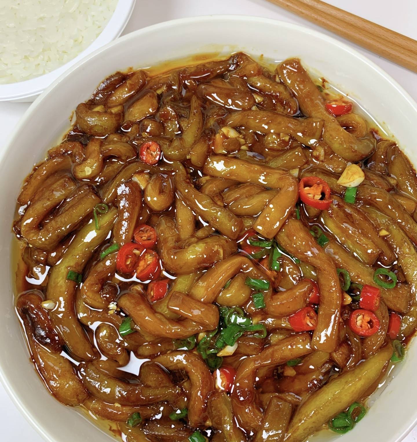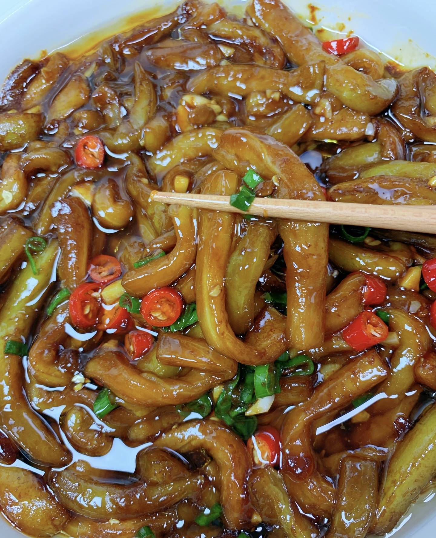 很多人做茄条最头疼的就是吸油太多,今天分享一个少油的秘诀!不用油炸,也不用多放油煸炒,直接用蒸锅蒸5分钟,蒸好的茄条会变软,后续炒的时候几乎不吸油,健康又省事。蒸好的茄条取出后,用筷子轻轻按压一下,挤出多余的水分,这样炒的时候更容易裹上酱汁,味道也更浓郁。起锅烧油,油热后先放入姜末、蒜末和小米辣爆香,炒出香味后倒入挤干水分的茄条,转中火快速翻炒1分钟,让茄条均匀吸收香料的香味。接着倒入提前调好的酱香汁,翻炒均匀后转小火慢煮2分钟,让茄条充分吸收酱汁的味道,煮到酱汁变得浓稠,紧紧裹在茄条上就可以了。最后撒上葱花,关火装盘,一道香气扑鼻的酱香茄条就做好了。刚出锅的酱香茄条色泽红亮,酱香浓郁,夹起一根放进嘴里,茄子软糯入味,酱汁咸甜适中,带着淡淡的蒜香和酱香,每一口都超下饭。而且这个做法全程不用复杂的步骤,蒸茄子的环节不仅省时间,还能减少吸油,新手也能轻松驾驭。