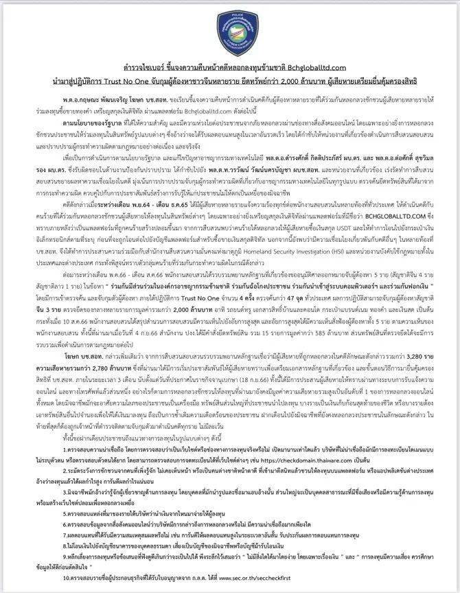 该案发生在2021年11月至2022年12月期间,泰国多个地区都有多名受害者向警方举报,起诉诱导受害者投资数字货币的犯罪分子。调查发现,犯罪分子诱骗受害人在名为数字货币假平台购买USDT。泰国警方与国土安全调查办公室 (HSI) 及国内外执法机构合作,共同查明了该案的犯罪团伙身份。