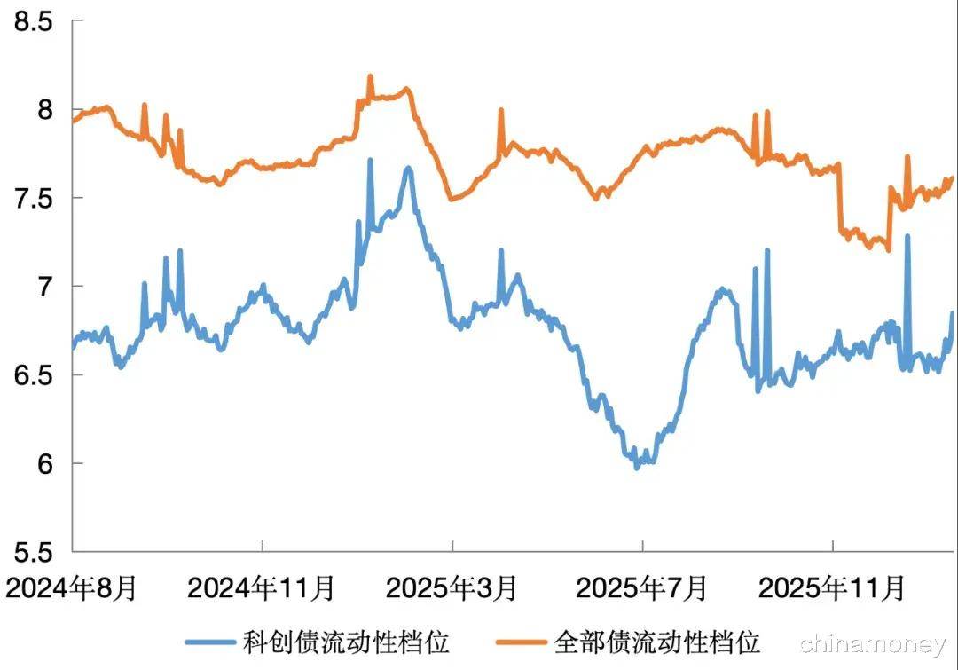 在个券层面,依托上述制度红利,科创债快速形成了显著优于市场整体的流动性优势。如图3所示,科创债平均流动性档位曲线长期位于全部信用债下方,反映出其流动性表现领跑市场。进一步数据显示,2025年上交所科创债年化换手率达140%,较公司债整体换手率高出约40个百分点,交易活跃度显著优于市场平均水平。
