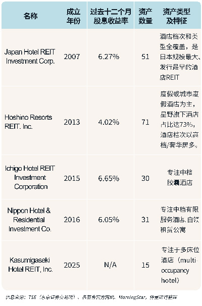 日本亚太酒店REITs先行者,特色策略助力成长日本目前共有5支酒店REIT产品,均布局境内。作为亚洲最早发展REITs的国家,日本各基金产品及覆盖的资产类型也更为丰富多元:
