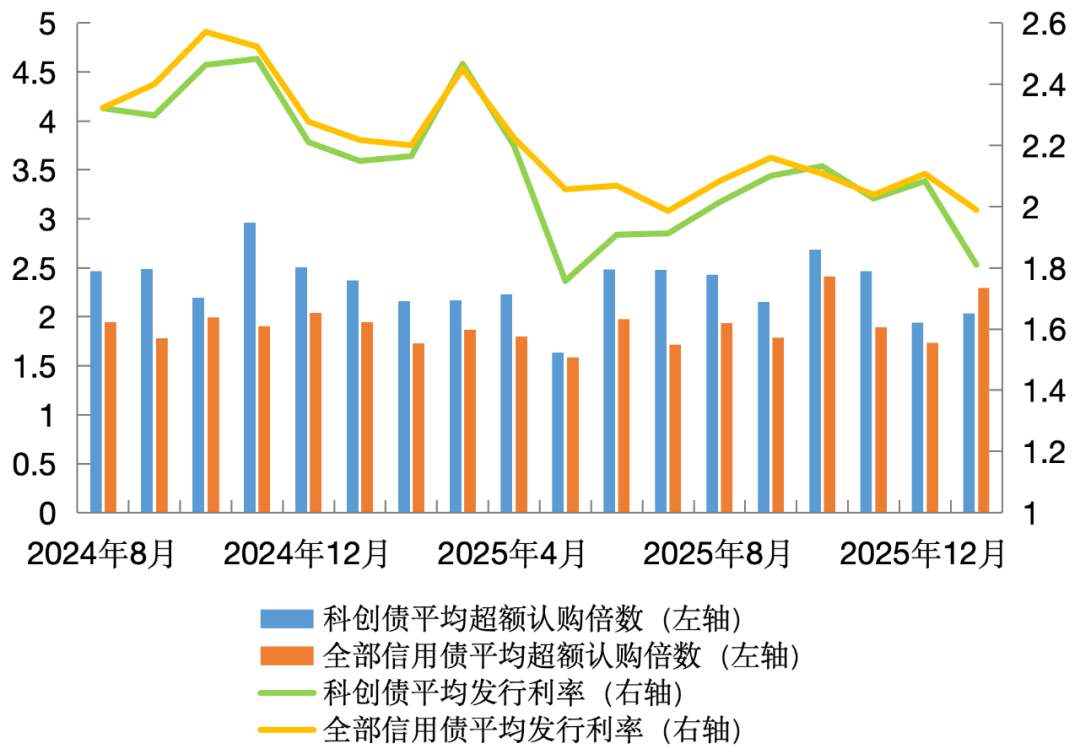 一级市场发行定价方面,科创债亦具有明显的成本优势,认购情绪火爆,并未出现因规模倍增而导致融资成本上行的局面。如图2所示,2025年下半年以来,科创债平均发行利率维持在2%左右,多次创下同期限同级别信用债的历史新低。这种低成本融资环境有效降低了科技企业的融资成本压力,为其增加研发投入提供了财务空间。与此同时,科创债在认购端表现活跃,平均超额认购倍数长期保持高位,反映出市场资金对于优质科创资产具有较强的配置意愿。