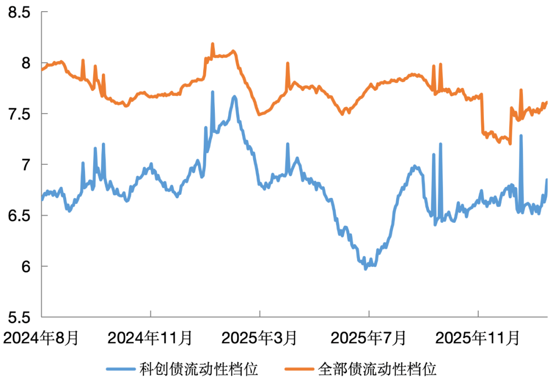 在个券层面,依托上述制度红利,科创债快速形成了显著优于市场整体的流动性优势。如图3所示,科创债平均流动性档位曲线长期位于全部信用债下方,反映出其流动性表现领跑市场。进一步数据显示,2025年上交所科创债年化换手率达140%,较公司债整体换手率高出约40个百分点,交易活跃度显著优于市场平均水平。