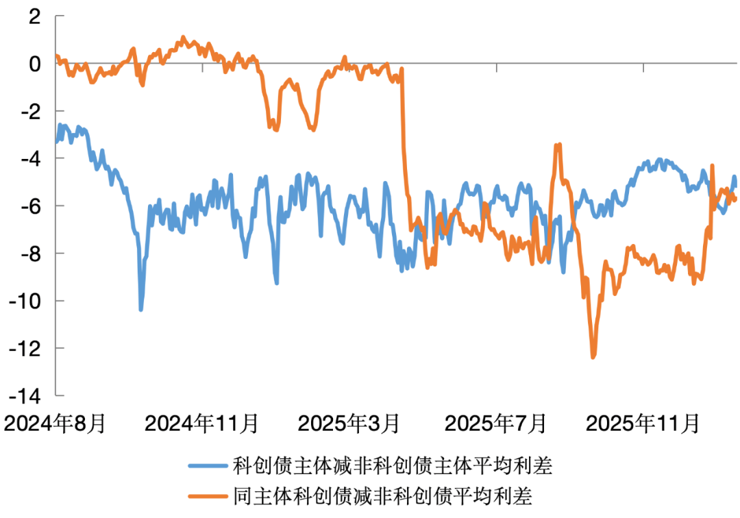 二级市场流动性的充裕不仅降低了投资者的交易成本,更是有效疏通了价格发现机制,推动市场资金实现对资产价值的挖掘。在信用定价方面,市场正逐步建立一套差异化的科创估值体系,形成了“科创主体利差+科创债利差”的双重定价逻辑。从利差分析可以看出,科创债发行主体的利差补偿较非科创主体低约6个基点,即便同一发行主体,其科创债利差也较普通债券低约5个基点。这意味着在“科创主体+科创品种”双重红利加持下,科创债较非科创主体发行的普通债券利差低逾10个基点,市场对带有“科创”标识的债券给予了明显的认可。如图4所示,2025年5月新政实施后,科创债的平均信用利差较同主体非科创债显著收窄。这种“科创利差”现象,既体现了市场对我国科技创新领域发展的坚定信心,也反映出在“资产荒”背景下,科创债凭借清晰的政策导向与严格的募集资金用途监管,被市场认定为具备较高安全边际的优质资产。按照债券市场“二级市场定价引导一级市场定价”的运行逻辑,当前交投活跃的科创债二级市场,能够有效承接一级市场的规模化发行,在稳定发行成本的同时,进一步引导发行利率下行。