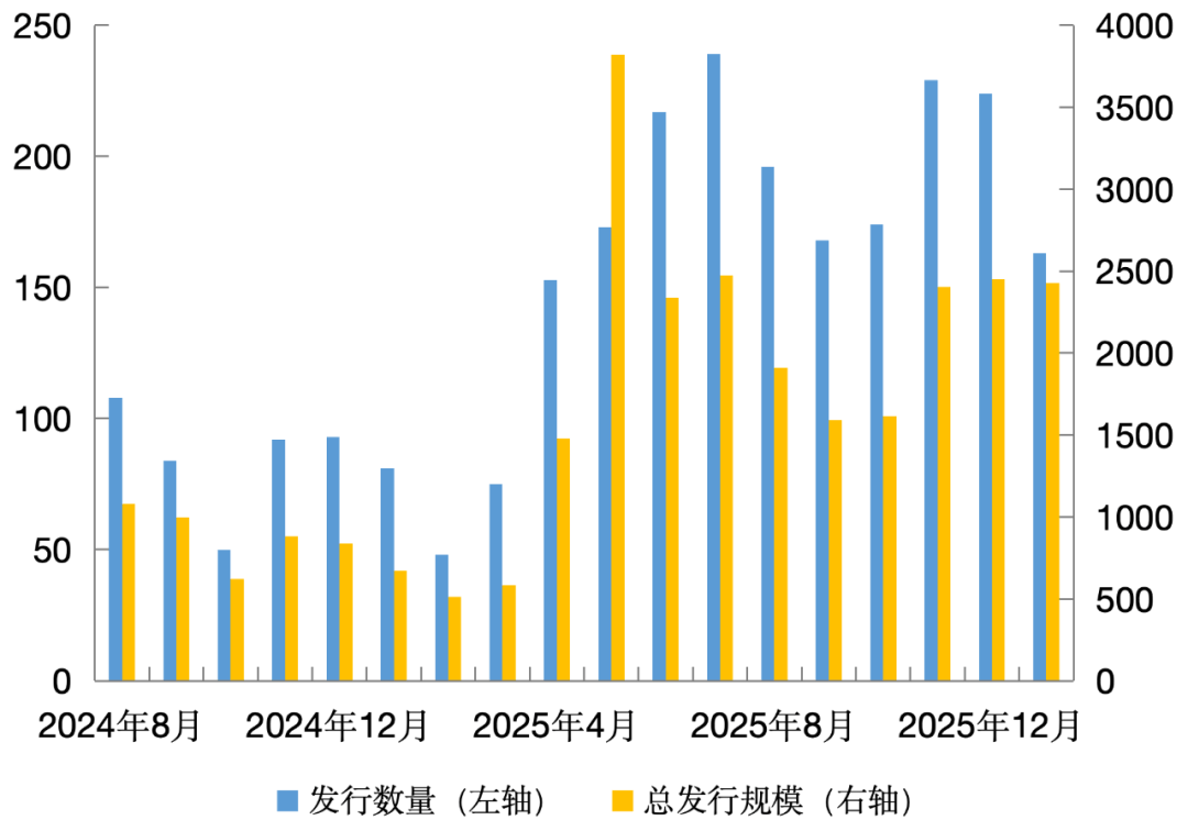 一级市场发行规模方面,自2024年下半年起,科创债发行数量与规模均呈稳步增长态势。如图1所示,受2025年5月债市科技板的政策推动,科创债发行规模实现跃升,政策发布当月的发行规模接近3500亿元,后续月份月均发行规模也逾2000亿元,相较于之前不足千亿元的规模,实现了数倍增长。
