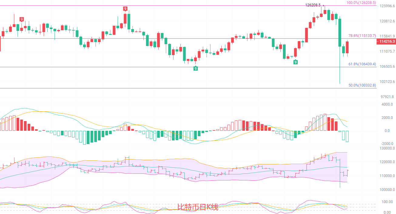 截止发稿前日K线,日线回到了趋势指标内,并且破了EMA90压力位113900,距离黄金分割线很近了,MACD缩量向下走空势依旧在,DIF和DEA向下死叉扩散不变,布林带中规阻力关注116400,思路上抵达115000上方以后可以找位置南下试仓了,在此之前别动