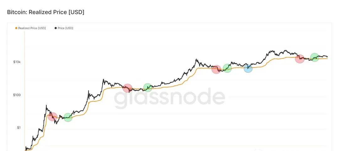 加密货币市场是否会出现下跌?比特币的已实现价格是根据已实现市值除以当前供应量计算的指标。相比之下,已实现资本化根据不同价格评估不同供应部分的价值。根据已实现价格与每日比特币价格变动的长期图表,我们可以看到周期性的相似性。通常,在每个周期中,当比特币价格跌破已实现价格时(以红色圆圈表示),市场投降期就开始了。