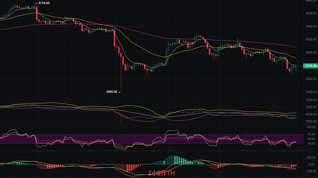 发稿前以太坊现价3918,丽盈观察目前盘口以太坊接近关键支撑位3400,并伴随看涨吞没形态,这为短期反弹提供了潜在支撑。然而,成交量极度缩量表明市场动能不足,且趋势指标显示价格位于短期和长期均线之下,均线呈向下倾斜,形成一定的下行压力。综合来看,市场短期内或维持震荡走势,需关注支撑位的有效性。日线小时价格在暴跌后出现小幅反弹,但整体仍处于下降趋势,高点逐步降低,低点不断刷新。MACD2小时空头力量占据主导日线级别MACD也处于死叉状态,延续下行趋势。EMA2小时空头排列,短期压力集中在3800附近,整体趋势短线周期出现反弹以后又加速下跌的可能存在,所以丽盈建议做好风控安全第一