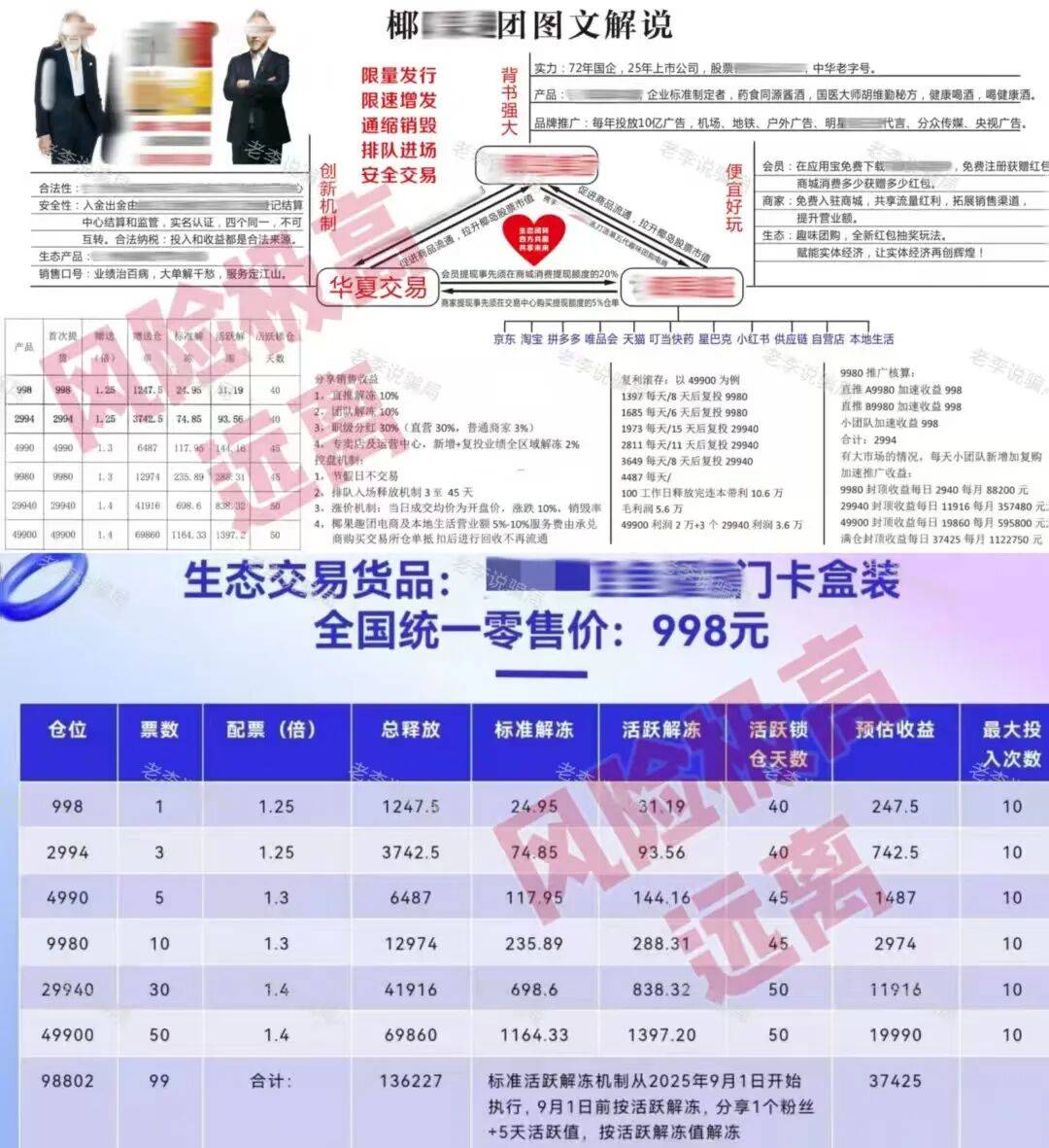 谎称为某上市公司,以“某龙门卡盒装”等产品为工具,用户在“椰某某团”APP注册后,通过购买998元-49900元等不同价位的产品仓位获得配票、解冻收益,同时设置直推、团队、职级分红等多层级分享收益,还有复利滚存、推广核算的高收益计算方式。