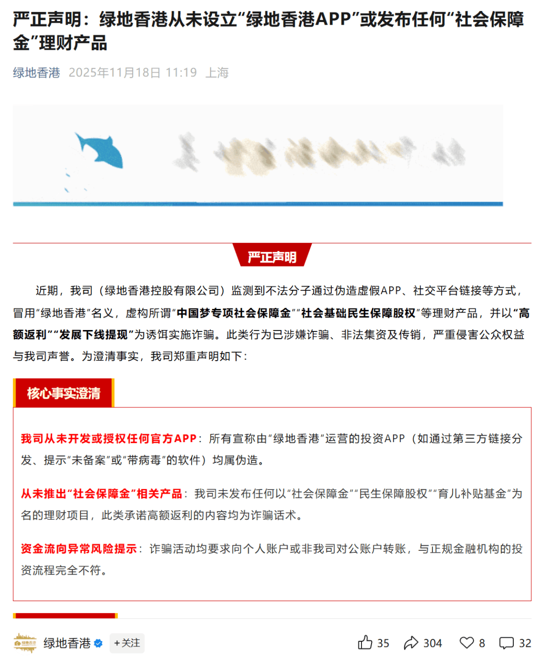 《严正声明:绿地香港从未设立“绿地香港APP”或发布任何“社会保障金”理财产品》