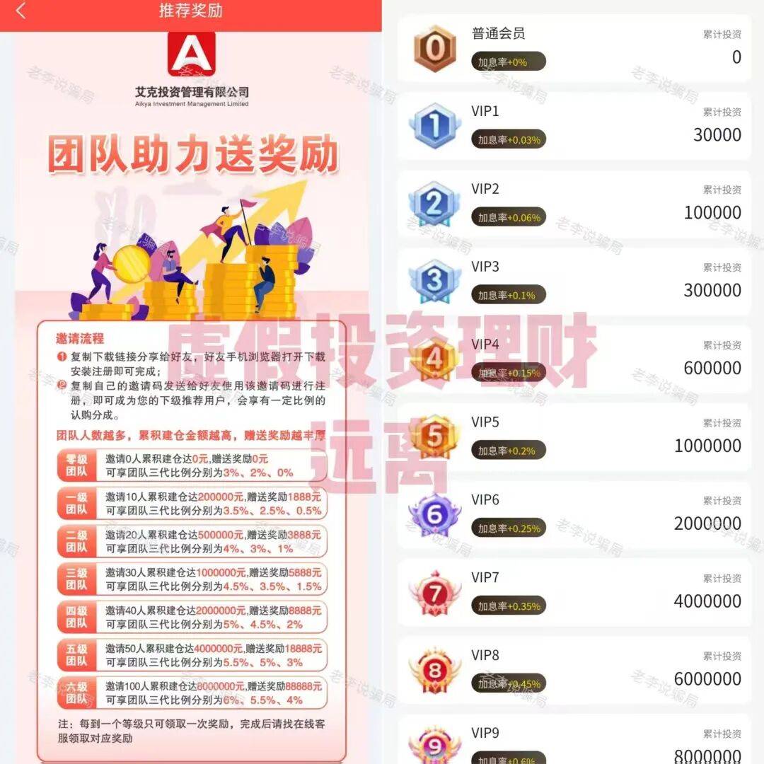 套用某企业名义发布虚假理财产品,以用户邀请人数和累计投资金额为依据,划分个人及团队等级,并根据等级发放对应奖励及加息福利。