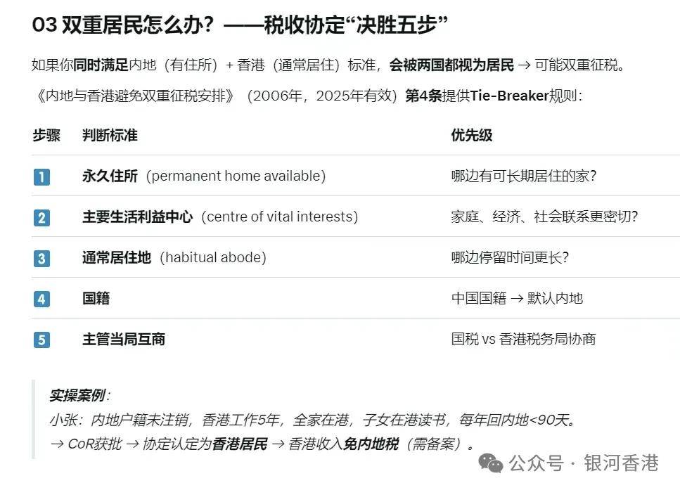 要是香港公司被同时认定为香港和内地双重税务居民(比如注册在香港,但董事会在内地召开、关键决策在内地做出),所以要及时利用香港与内地的税收安排解决争议,避免信息错误交换引发稽查,一般可以通过加比原则来判断属于内地还是香港的税务居民身份。加比规则的核心逻辑是“实质重于形式”,优先考量个人的实际生活和经济利益中心。